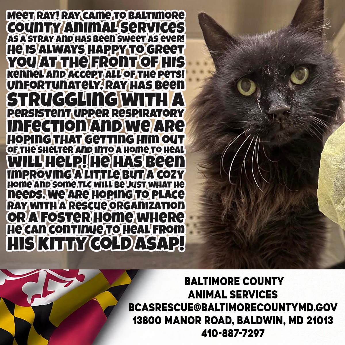 Meet Ray! Ray came to Baltimore County Animal Services as a stray and has been sweet as ever! He is always happy to greet you at the front of his kennel and accept all of the pets! Unfortunately, Ray has been struggling with a persistent upper respiratory infection and we are hoping that getting him out of the shelter and into a home to heal will help! He has been improving a little but a cozy home and some TLC will be just what he needs. We are hoping to place Ray with a rescue organization or a foster home where he can continue to heal from his kitty cold asap!