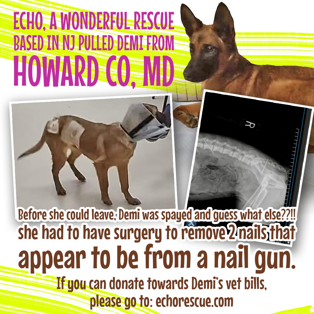 We are helping again... Echo has Demi! Before she could leave, Demi was spayed and guess what else??!! she had to have surgery to remove 2 nails that appear to be from a nail gun.